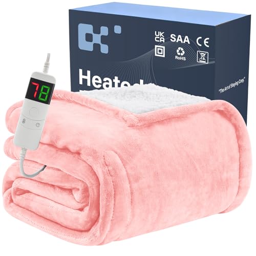 BOMOVA Electric Heated Blanket Single Throw (130x160cm,Light Pink)-Flannels Fleece Winter Warm Blanket,10-Level Heating & 5 Auto Timer,Cozy Sofa Throw for Home Office,Xmas House Warming New Home Gifts