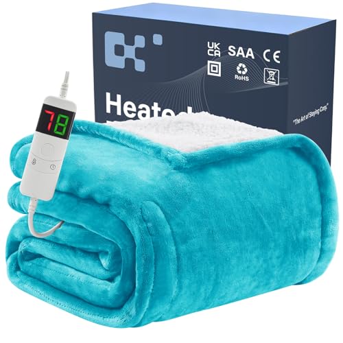 BOMOVA Electric Heated Blanket Single Throw (130x160cm,Teal)-Flannels Fleece Winter Warm Blanket,10-Level Heating & 5 Auto Timer,Cozy Sofa Throw for Home Office,Xmas House Warming New Home Gifts