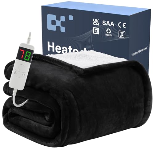 BOMOVA Electric Heated Blanket Single Throw (130x160cm,Black)-Flannels Fleece Winter Warm Blanket,10-Level Heating & 5 Auto Timer,Cozy Sofa Throw for Home Office,Xmas House Warming New Home Gifts