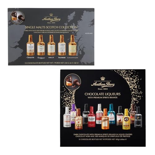 Anthon Berg Signature Spirits Bundle, Refined & Sophisticated Chocolate Experience - 1x15 Single Malt Scotch Whisky Liqueurs (230g) & 1x12 Chocolate Liqueurs with Famous Spirit Liquid Filling (187g)