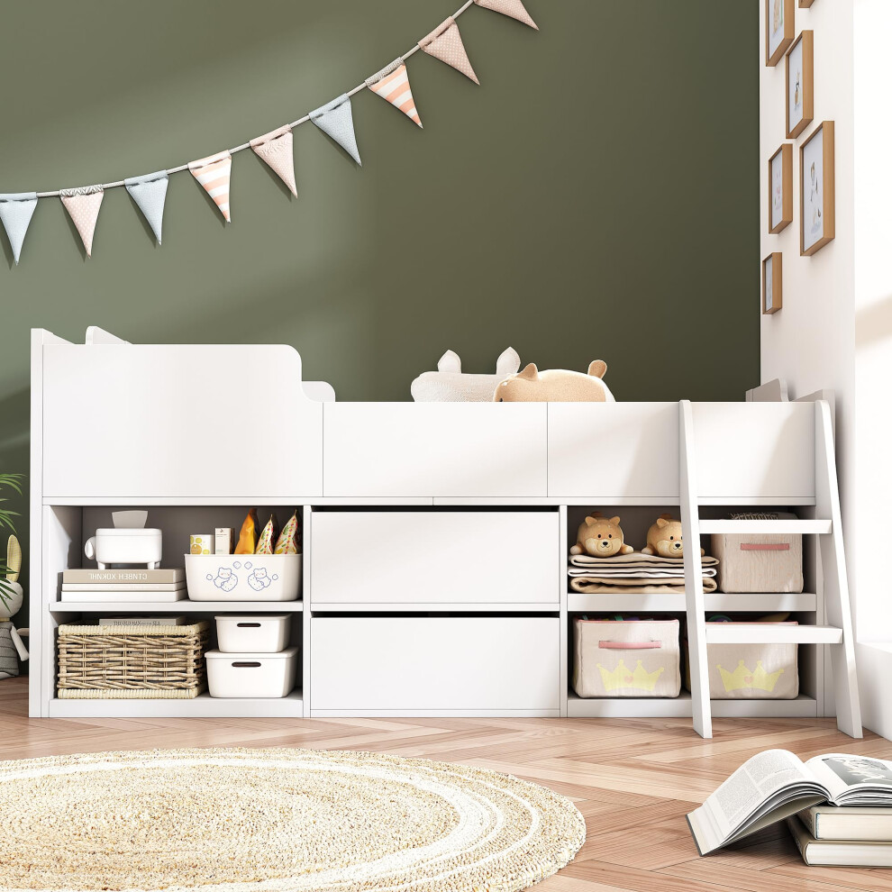 Merax 3ft Single Cabin Bed with Drawers and Shelf Storage Mid Sleeper Bed Frame - Ideal Mid Sleeper Bed for Kids (90 x 190 cm) No Matress, White