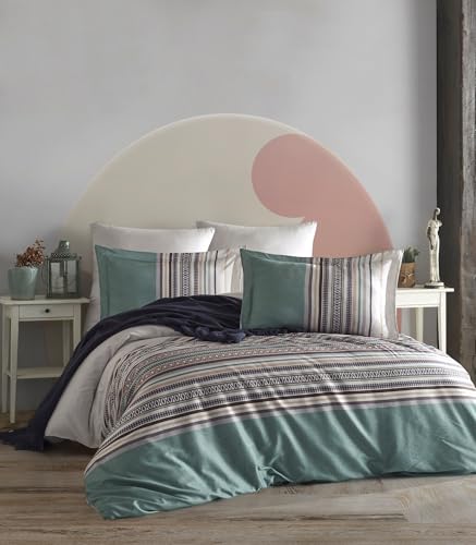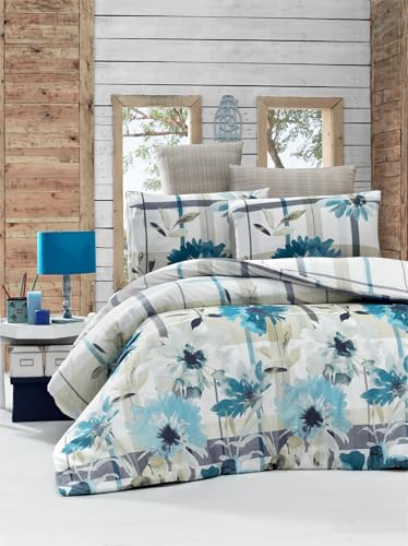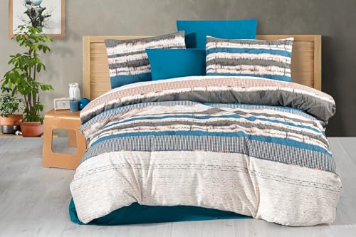 Nuit Des Rêves Ranforce Single XL Quilt Cover Set, 155 x 200 cm, 100% Cotton, Machine Washable, 145 Thread Count, Blue & Beige, Stylish & Comfortable Bedding