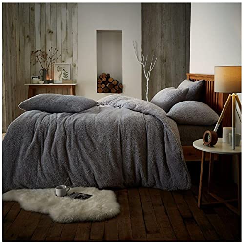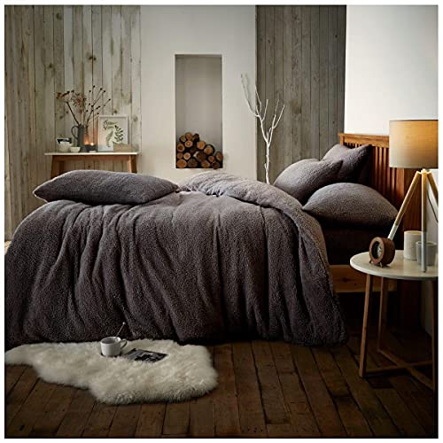 GC GAVENO CAVAILIA Teddy Bear Fleece Plain Single Quilt Cover Set - Soft Thermal Warm & Cosy Fluffy Single Bedding Set - Charcoal - 137cm x 200cm