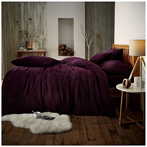 GC GAVENO CAVAILIA Teddy Bear Fleece Plain Single Quilt Cover Set - Soft Thermal Warm & Cosy Fluffy Single Bedding Set - Aubergine - 137cm x 200cm