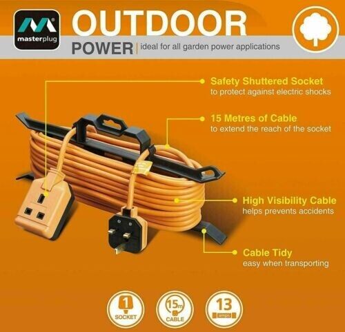 Masterplug 15M Outdoor Single Socket Extension Lead with H Frame Cable 13 Amp UK