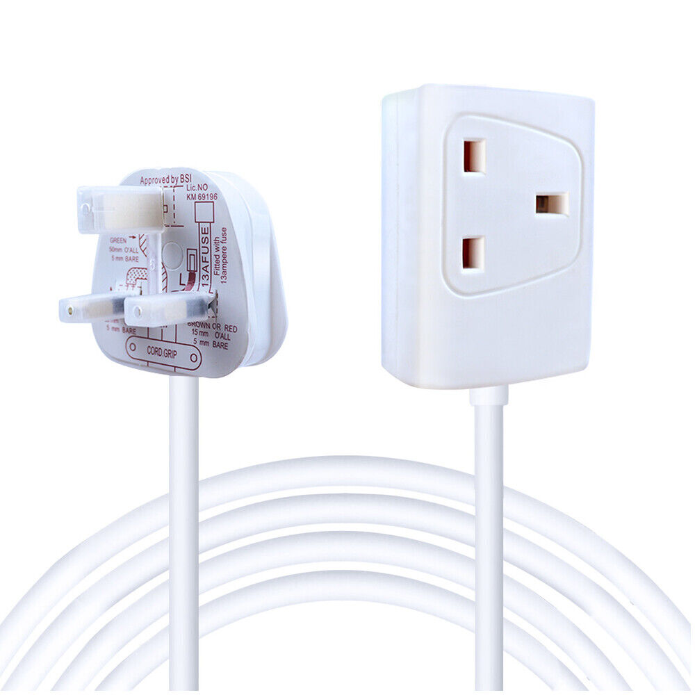 1 Way Gang Single Socket Power Mains Extension Lead Cable 2Meter White UK Plug
