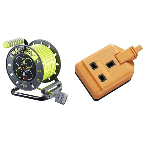 Masterplug Pro-XT Four Socket Open Cable Reel Extension Lead with Winding Handle, Thermal Cut Out & EXS13110O-01 Heavy Duty Single Socket Extension Lead, 10 Metres, Orange