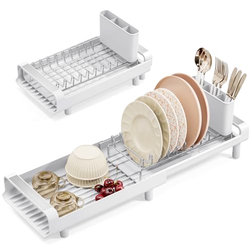 Dish Drainer Rack, Small Dish Drainer, Expandable Dish Rack With Removable Cutlery Holder, Anti Rust Small Drying Rack for Sink, Compact Draining Board Rack For Kitchen Counter, White