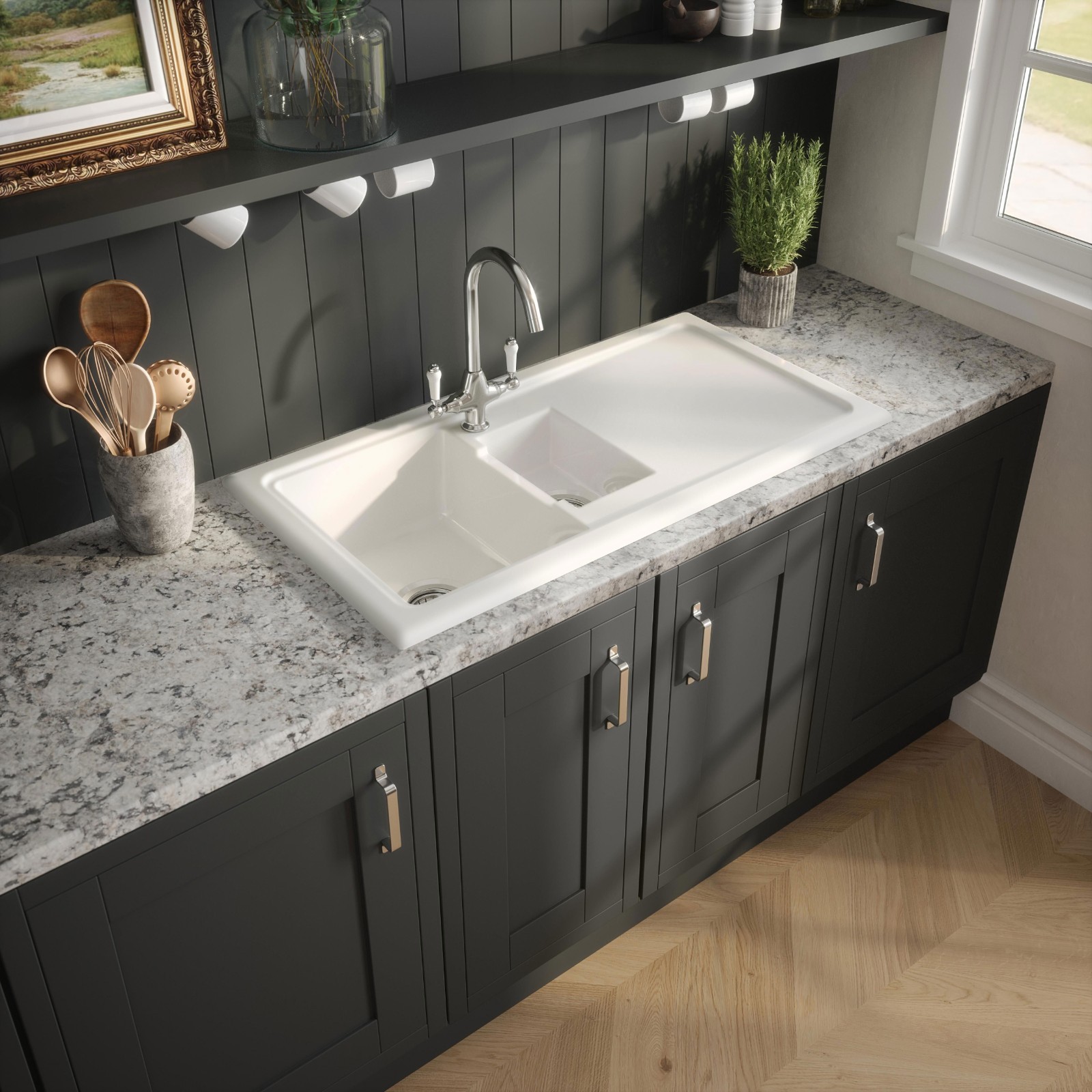 101cm 1.5 Bowl Fireclay Inset Kitchen Sink, Drainer & Compatible Wastes, White