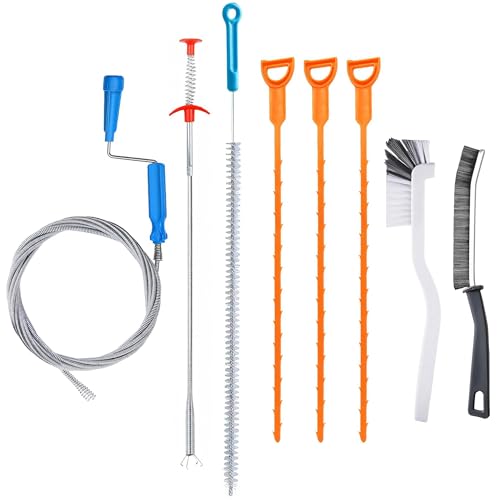 Drain Snake Toilet Unblocker Tool - 3M Sink Drain Plumbing Unblocker Wire, 50CM Drain Snake, 60CM Toilet Auger Hair Clog Remover with Claw, 70CM Sink Cleaning Brush, 6PCS (Orange)
