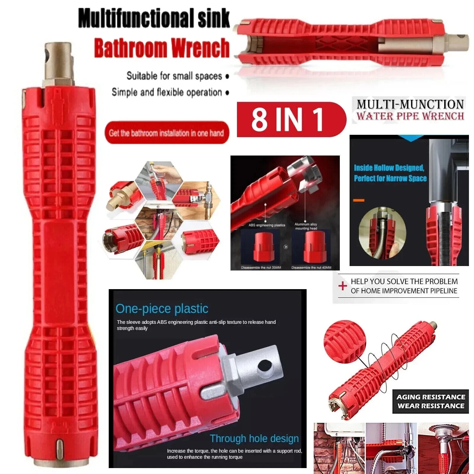 JORETLE 14 in 1 Faucet and Sink Installer,Faucet and Sink Wrench,Multifunctional Sink Wrench,Suitable for Installing Pipes Under Bathrooms,Toilets,Kitchens,and Sinks(Red)