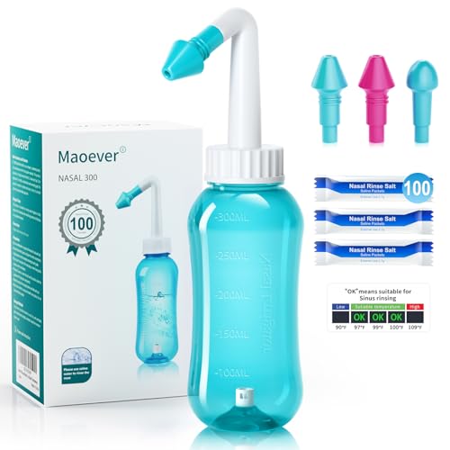 MAOEVER Neti Pot Sinus Rinse Bottle Nose Wash Cleaner Pressure Rinse Nasal Irrigation for Adult & Kid BPA Free 300 ML with 30 Nasal Wash Salt Packets and Sticker Thermometer(Blue)