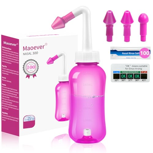 MAOEVER Neti Pot Sinus Rinse Bottle with 100 Nasal Wash Salt Packets Nose Wash Cleaner Pressure Rinse Nasal Irrigation for Adult & Kid BPA Free 300 ML with Sticker Thermometer(Pink)