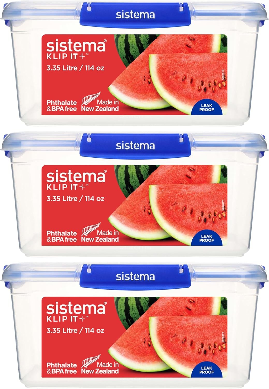 Sistema KLIP IT PLUS Food Storage Containers | 3.35 L | Leak-Proof, Stackable & Airtight Fridge/Freezer Containers with Lids | BPA-Free Plastic | Blue Clips | 3 Count