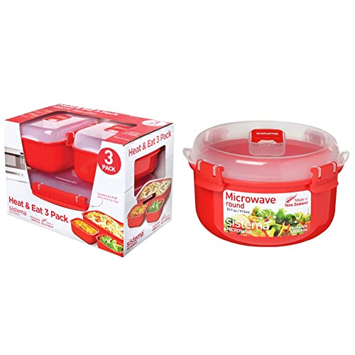 Sistema Microwave Rice Cooker (2.6L) & Round Microwave Food Container (915ml) Set | 2 Count & Heat & Eat Microwave Containers | Stackable Lunch Boxes with Clip-Close Lids | Red/Clear | Pack of 3