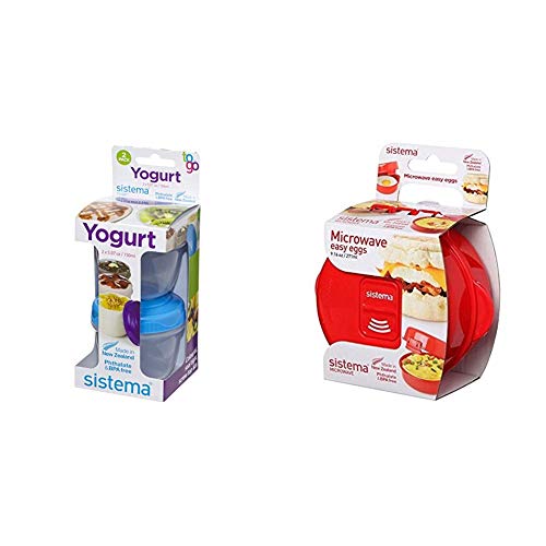 Sistema Yogurt to Go Round Containers, 150 ml - Pack of 2 & Microwave Egg Cooker Easy Eggs, 270 ml - Red