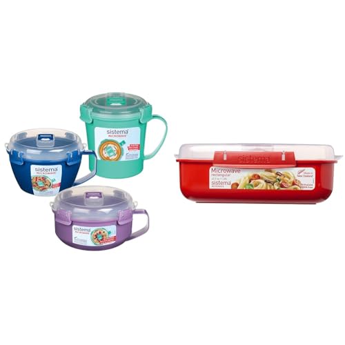 Sistema 3 Pack Soup, Porridge & Noodle Bowl to Go, Assorted Colours & Rectangle Microwave Container | 1.25 L | BPA-Free | Red/Clear