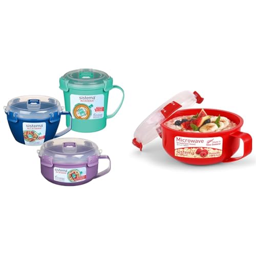 Sistema 3 Pack Soup, Porridge & Noodle Bowl to Go, Assorted Colours & Microwave Breakfast Plastic Bowl | Round Microwave Container with Lid & Steam Release Vent | 850 ml | BPA-Free | Red | 1 Count