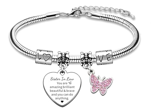 AMZQ Sister In Law Bracelet Inspirational Charm Pink Butterfly Gifts Sister In Law Christmas Birthday Gift You Are Amazing Brilliant Beautiful & Brave And You Can Do Anything…
