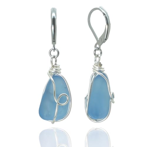 PEPELUALI Handmade Sterling Silver Sea Glass Wire Wrap Drop Earrings Jewelry (Sky Blue),Beach Earrings, Summer Gift, Ocean Jewelry Inspirational Gifts for Women, Mom, Sister