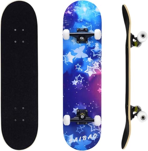 ERNAN Complete Skateboard for Beginners,31 x 8 Inch Double Kick Skateboard for Kids Teenagers & Adults. with Skate T-Tool. (blue-white star)