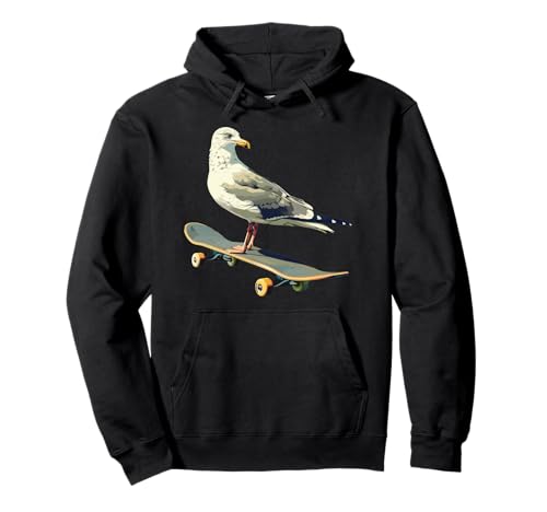 Funny Beach Seagull with Skateboard for Adults and Kids Pullover Hoodie