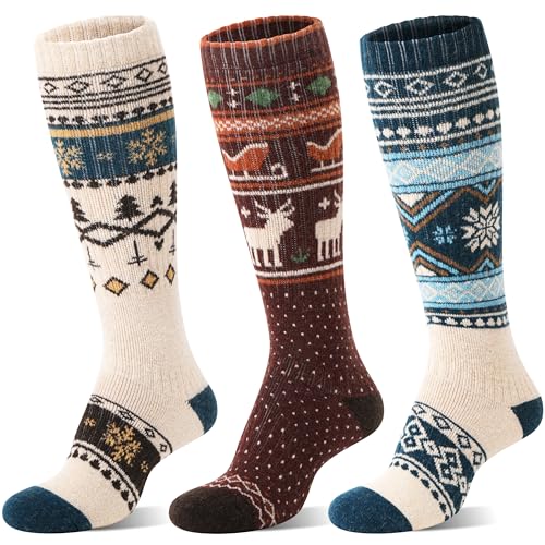 Merino Wool Ski Socks for Mens Womens Winter Thermal Warm Heated Thick Knee High Snowboarding Skiing Socks for Cold Weather 3 Pairs Gifts Stocking Fillers(Nordic,M)