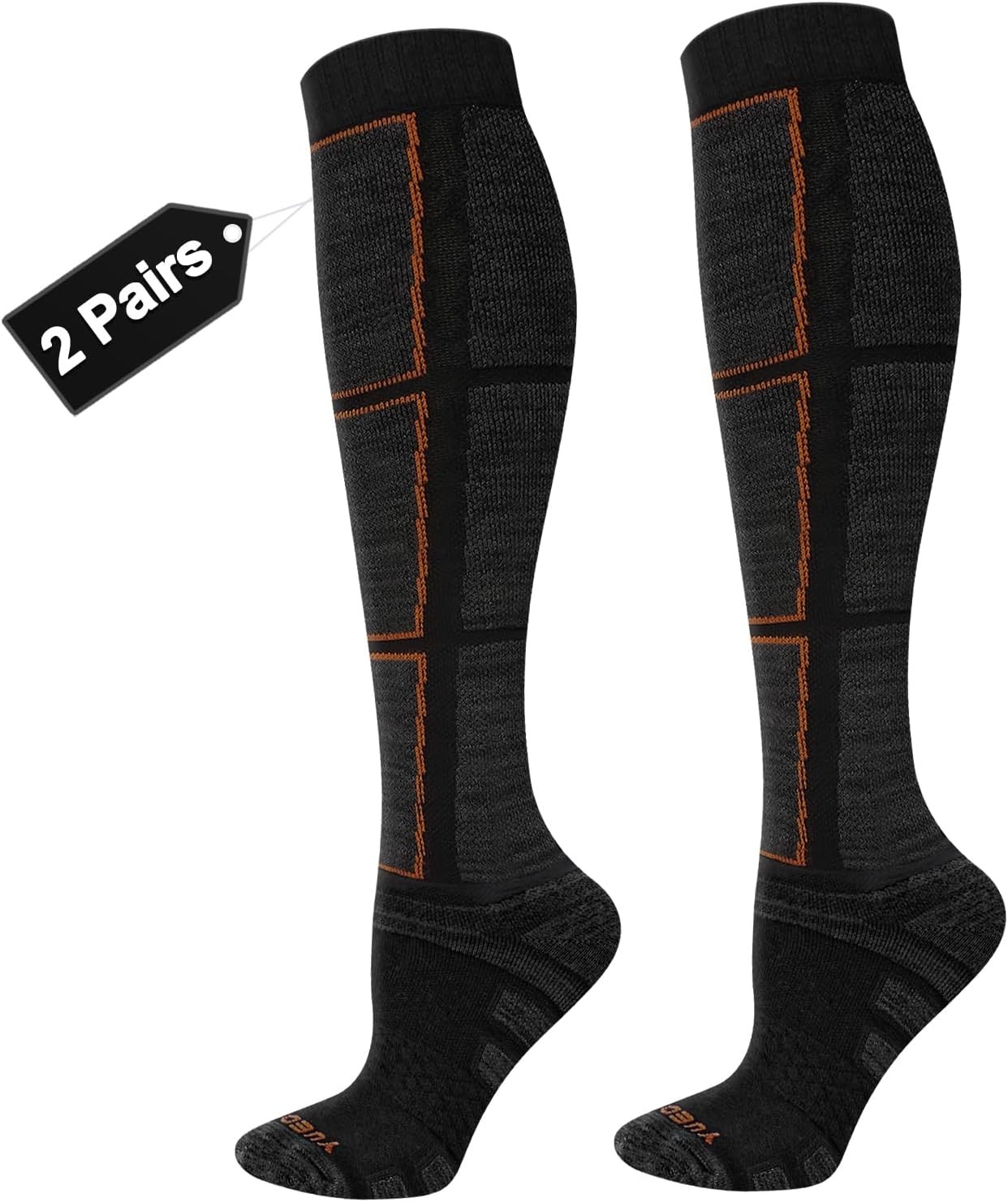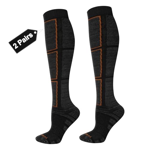 YUEDGE Mens Black Grey Cushioned Snowboarding Skiing Hunting Work Boot Athletic Sports Socks For Men 6-10, Sweat Wicking Cotton Knee High Long Thermal Thick Mens Socks, 2 Pairs