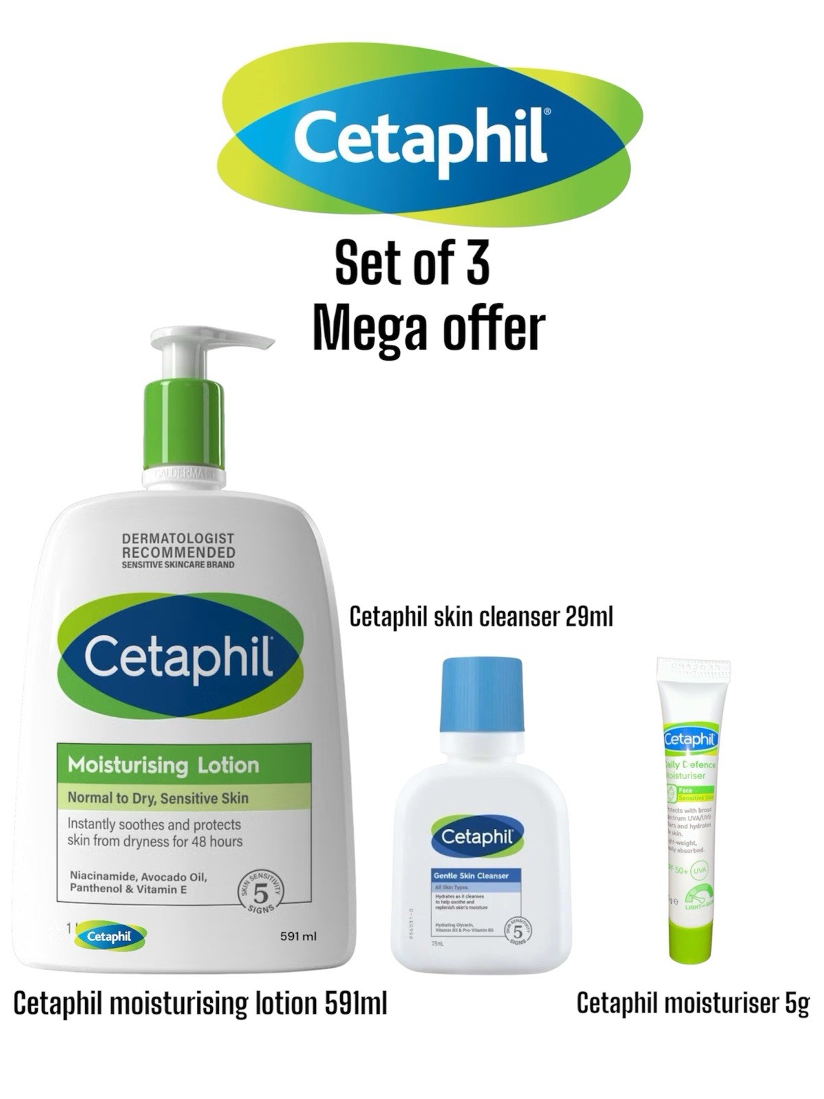 Cetaphil Set Of 3 Moisturising Lotion, Gentle Skin Cleanser& Defence Moisturiser