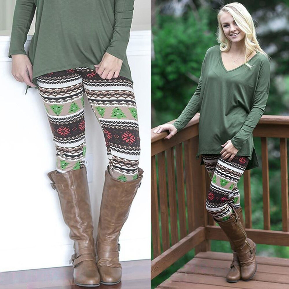Casual Women Lady Skinny Christmas Tree Print Stretchy Pants Slim Leggings