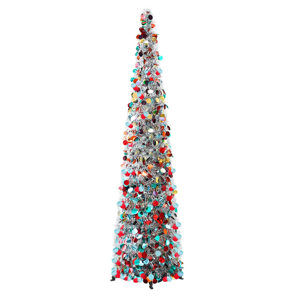 5Ft/1.5M Pop Up Collapsible Christmas Tree with Lights, Silver Tinsel Skinny Pe