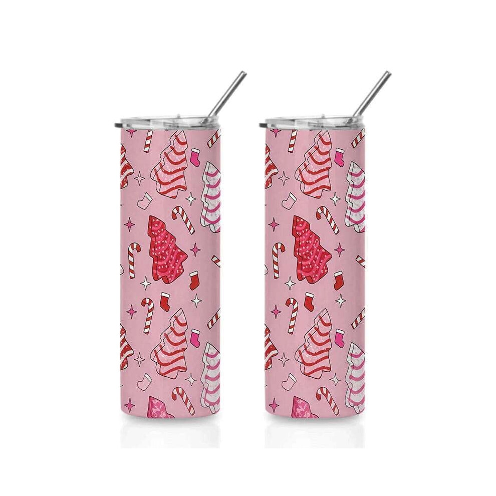 Pink Christmas Tree Cakes Stainless Steel Skinny Cup with Straw, Sweet Holiday Snack & Candy Cane Design Insulated Coffee Mug