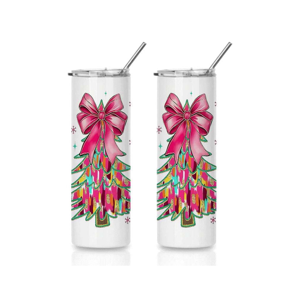 Skinny Stainless Steel Tumbler with Lid & Straw, Pink Bow Christmas Tree Design, Double-Wall Insulated Holiday Travel Cup