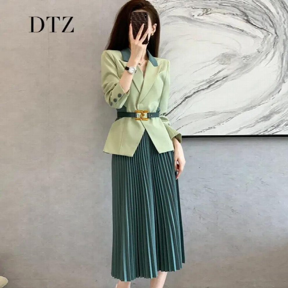 Women Spring Autumn 2 Piece Set Female Long Sleeve Jackets and Pleated Skirt Ladies Solid Blazer Suits with Belt L45