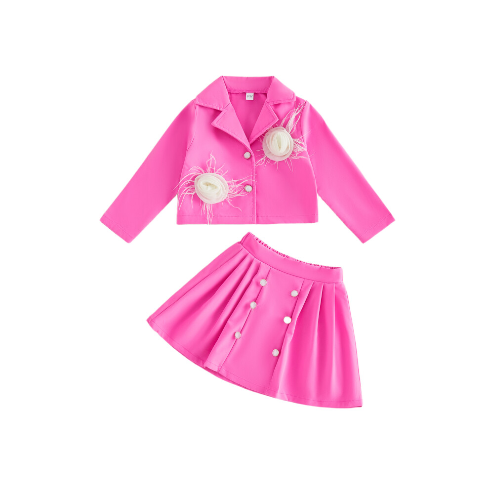 (5 Years, Rose Red) Little Girl Fall Outfit Preppy Style Flower Long Sleeve Button-up Blazer and Pleated Skirt 2 Piece Set