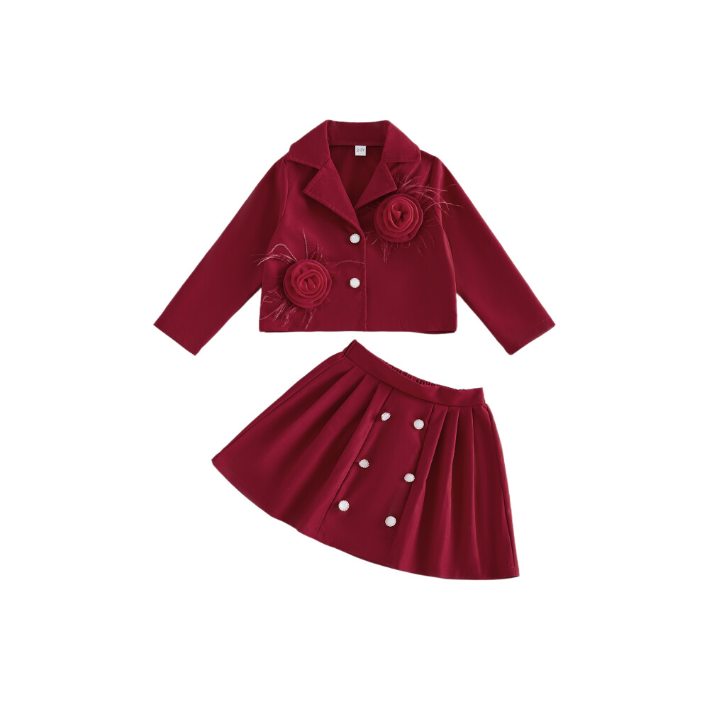 (5 Years, Wine Red) Little Girl Fall Outfit Preppy Style Flower Long Sleeve Button-up Blazer and Pleated Skirt 2 Piece Set