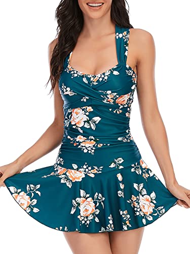 Eomenie One Piece Swimdress Swimsuits for Women Tummy Control Swim Dresses Skirt Bathing Suit, Deep Green, Floral Printed, Medium