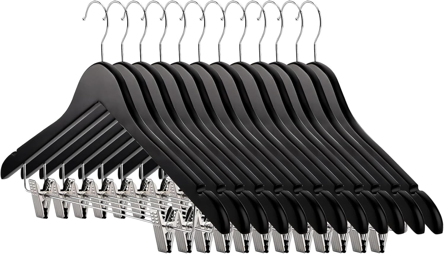 12 Pack Black Wooden Hangers with Clips, Solid Wood Suit Skirt Hangers with Heav