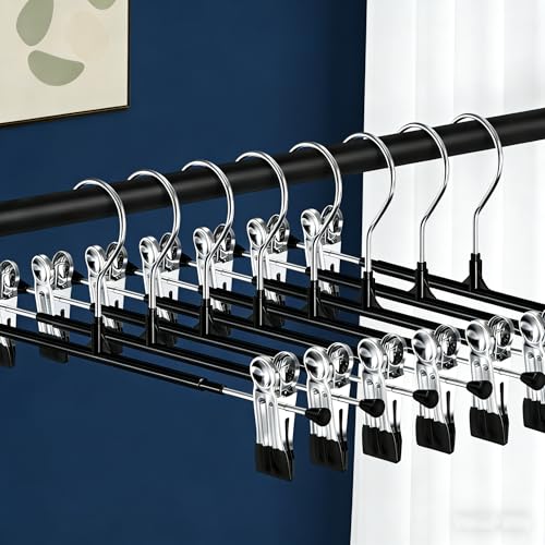 Trouser Hangers -10Pack Skirt Hangers with Adjustable Non Slip Clips Strong Chrome Clothes- Space Saving Pant Hangers (Black)