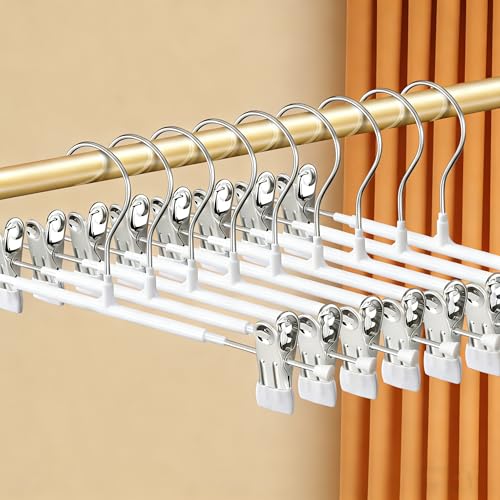 Trouser Hangers -10Pack Skirt Hangers with Adjustable Non Slip Clips Strong Chrome Clothes- Space Saving Pant Hangers (White)