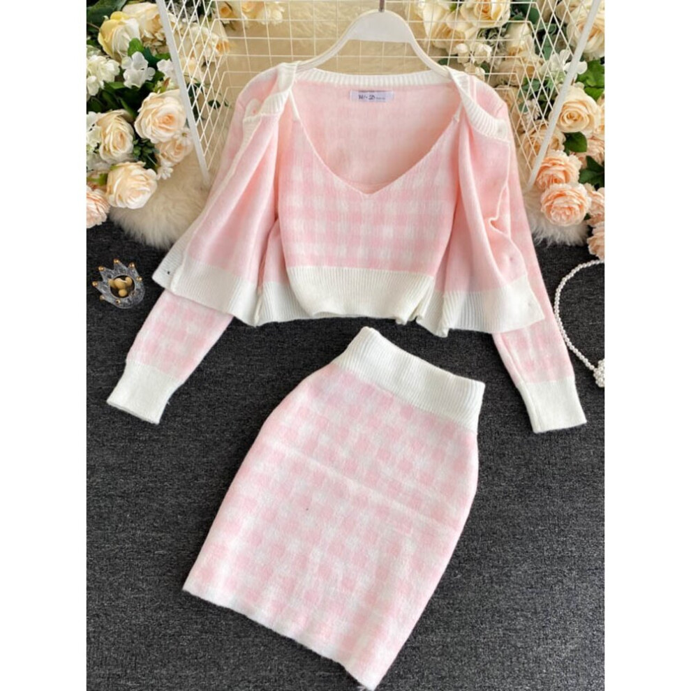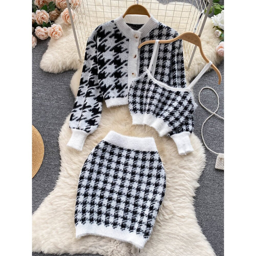 Autumn Knit Plaid Cardigans + Camisole + Skirts 3pcs Sets Short Sweater Coat + Vest + Mini Skirt Suits Women Outfits