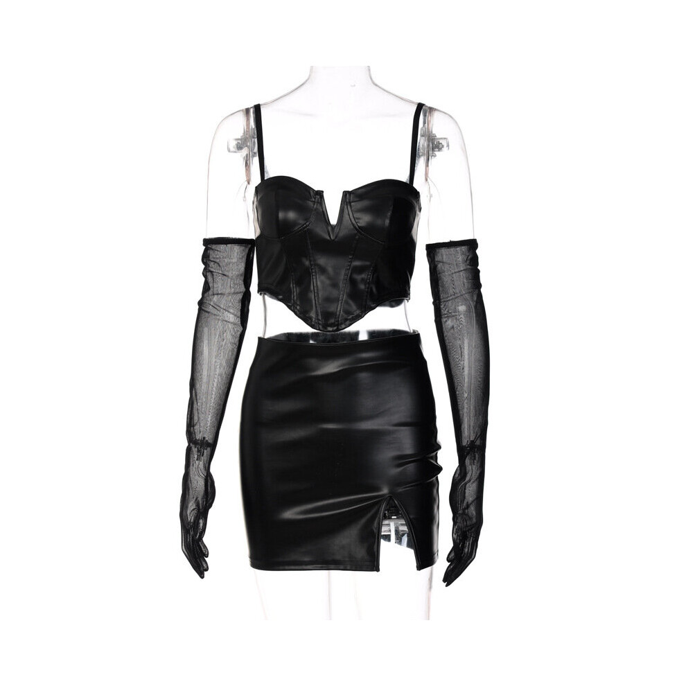 Slip Crop Top Camis Pu Leather Mini Skirt Suits Women Two Piece Matching Set Party Night Club Sexy Vacation Outfits