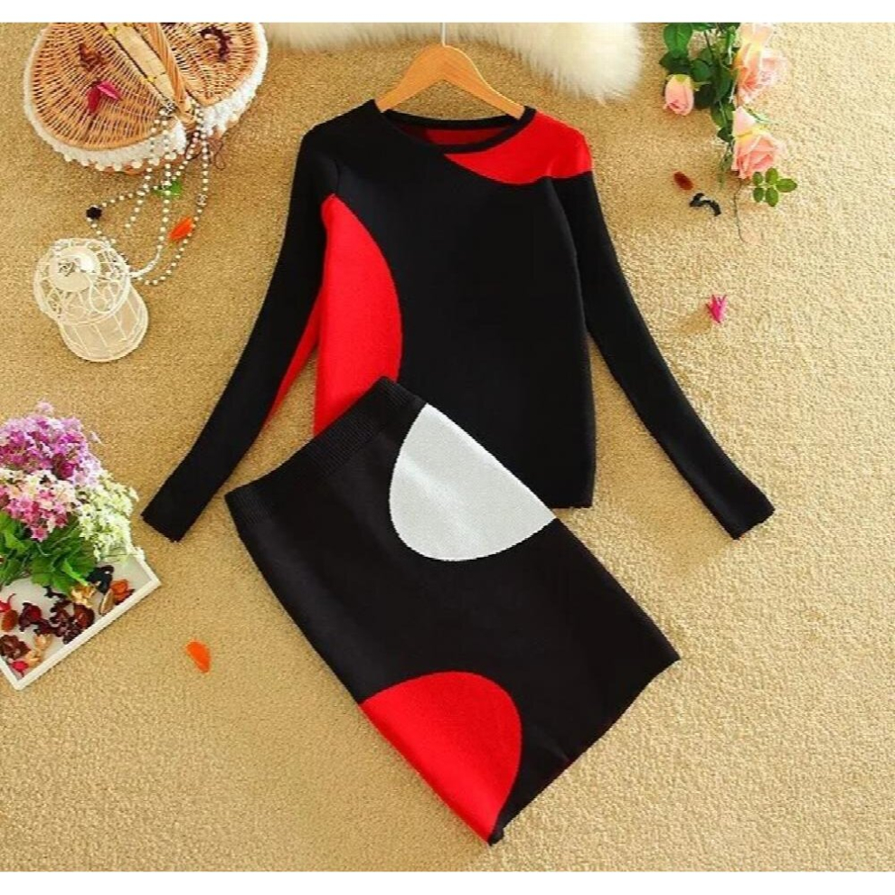 Spring Fall Women Knit Skirt Suits Geometric Pattern Women Sweater Top and One Step Knited Skirt Sets Red Tracksuit