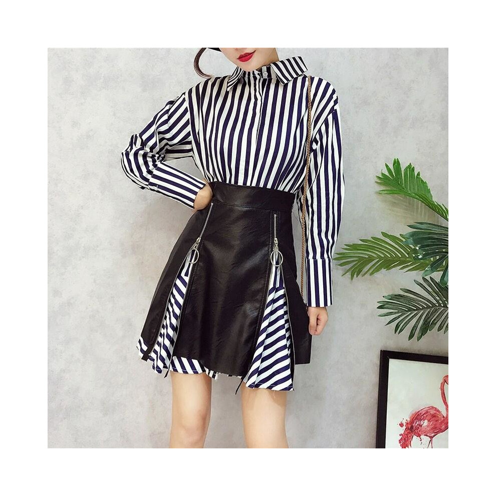 Newest 2017 2 Piece Set Fashion Fall Women Stripe Long Blouse Top And Zipper PU Skirt Suits Women Clothing Sets