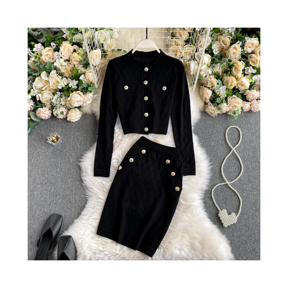 (black, S) Elegant Knit Plaid Blazer Cardigan + Slim Skirt Suits Outfits Women Fashion Office Two Piece Set Vintage Metal Button Lady Suits