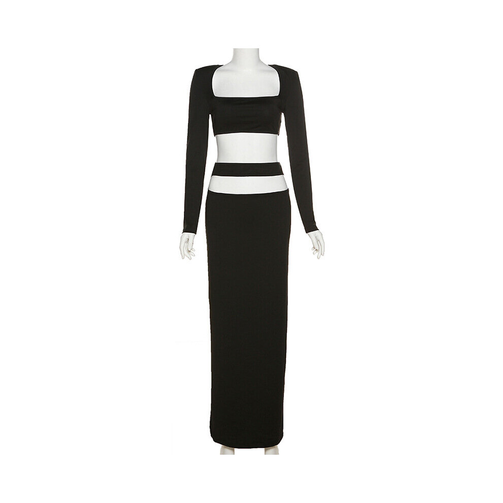 Two-Piece Skirt Suits for Women Long Sleeve Square Neck Crop Tops+High Waist Hollow Out Long Skirt Streetwear Set