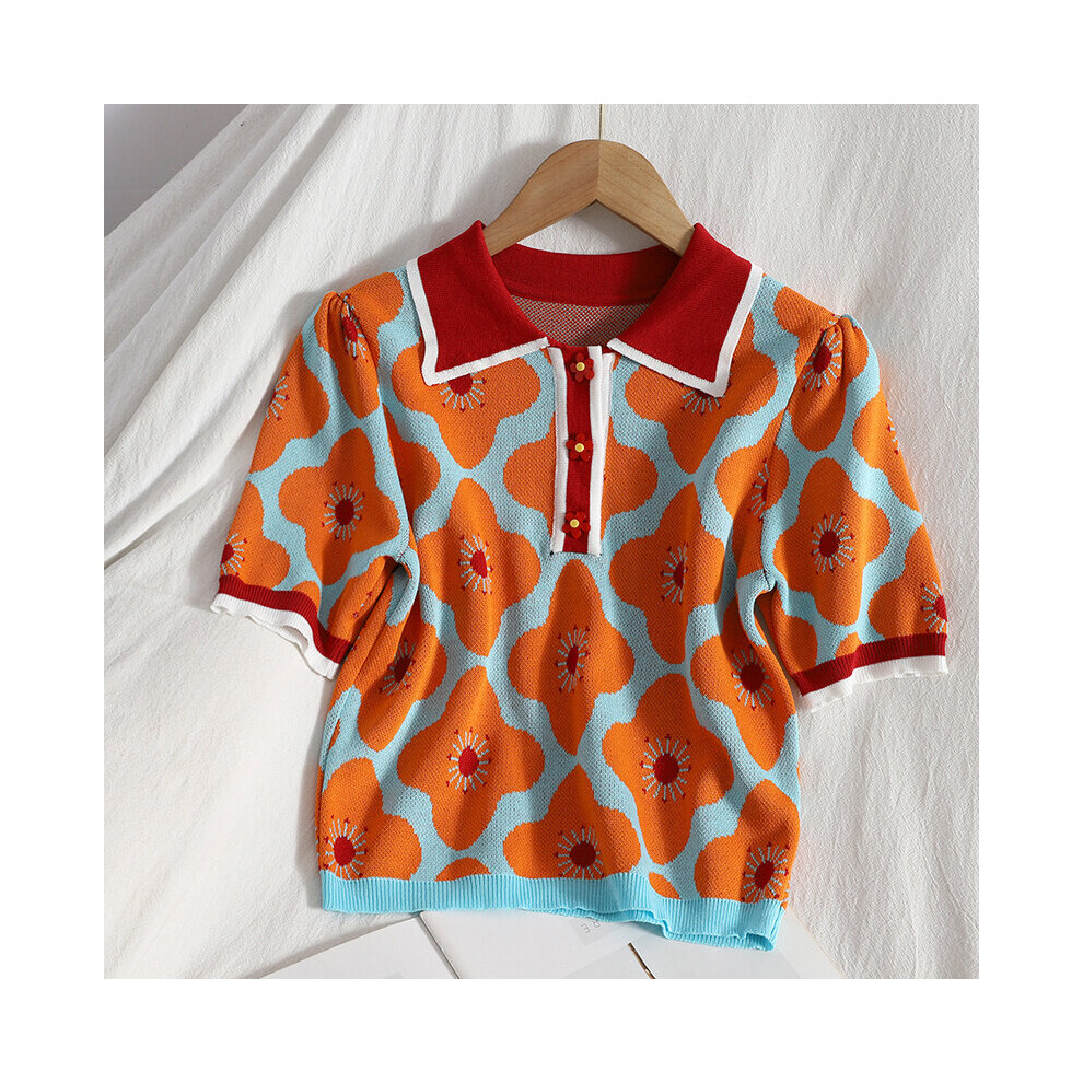 Summer Knit Skirt Suits Women Short Sleeve FlowerJacquard Sweater Cropped Top + Mini Pleated Skirt Set 2pcs Suit