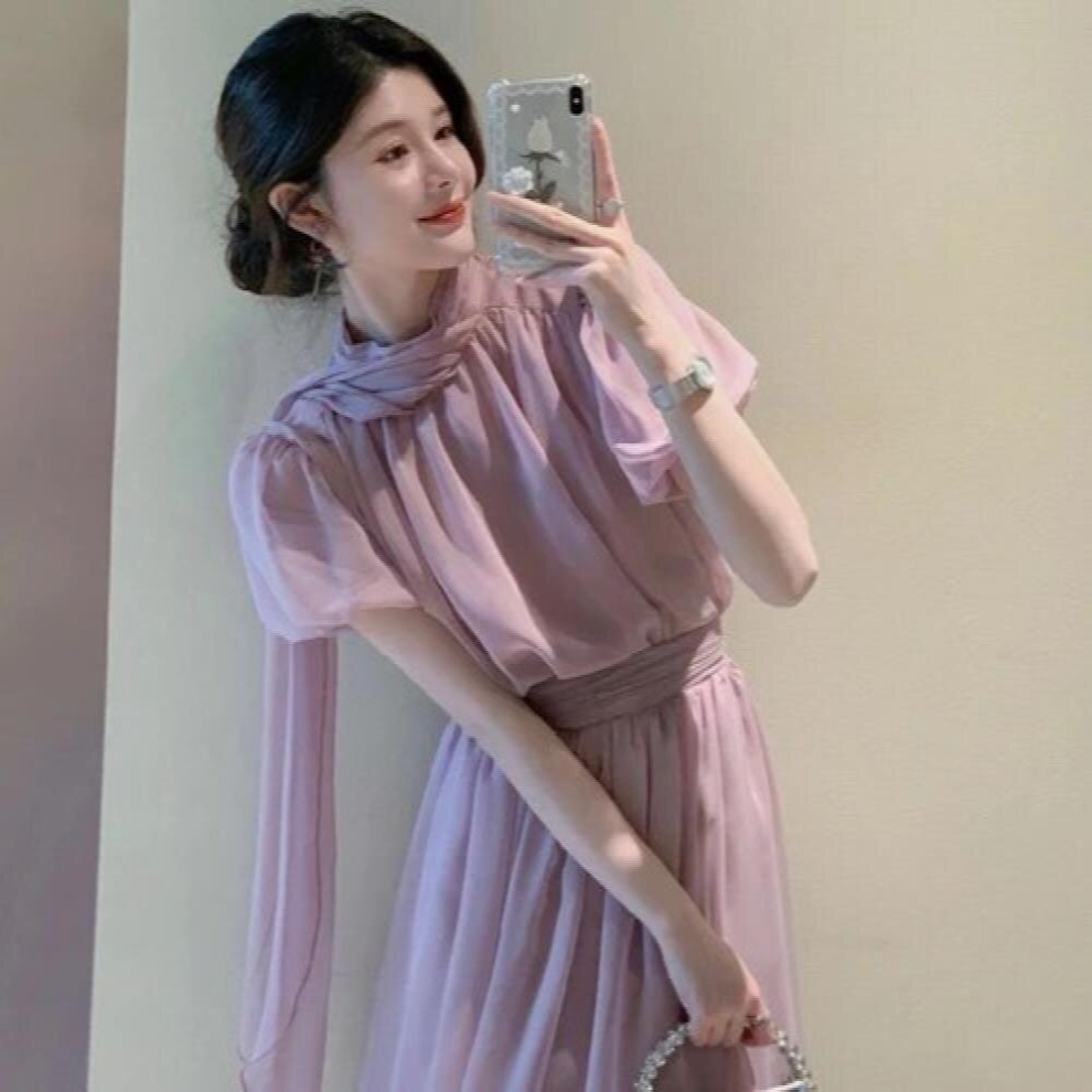Style Sweet Stand Collar Lace Up Puff Sleeve Shirts+ High Waist Thin Skirt Suits Summer Women 2pcs Sets