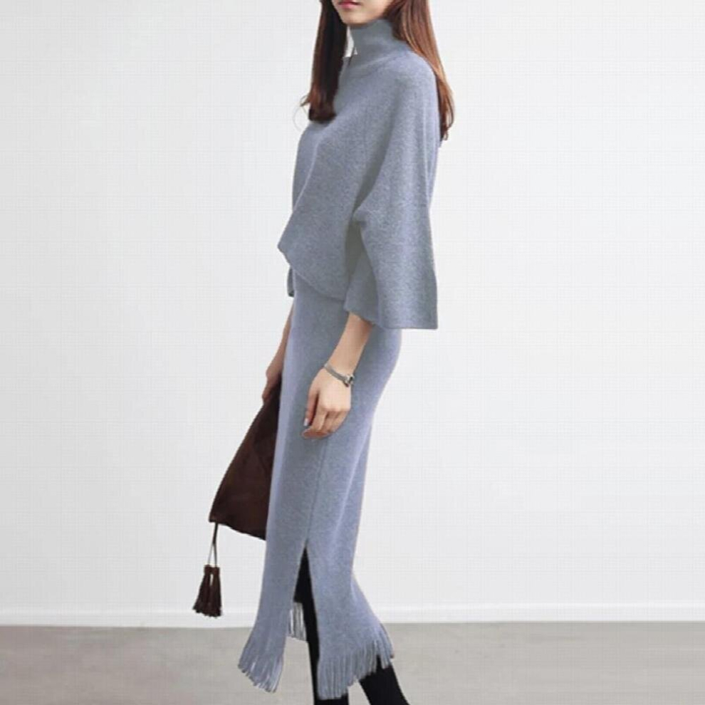 Turtleneck Sweater Skirt Two Pieces Suits Women Autumn Winter 2022Elegant Loose Knit Pullover+Side Split Midi Fringed Skirts Set