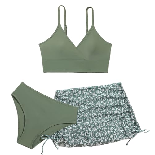 Momkonzz Girls Swimming Costume Kids Swimsuits Bikini Set 3 Piece Bathing Suits Teen Flower Bikini Strap Set with Skirt Cover Up Surfing Beach Swimwear Green 13-14 Years